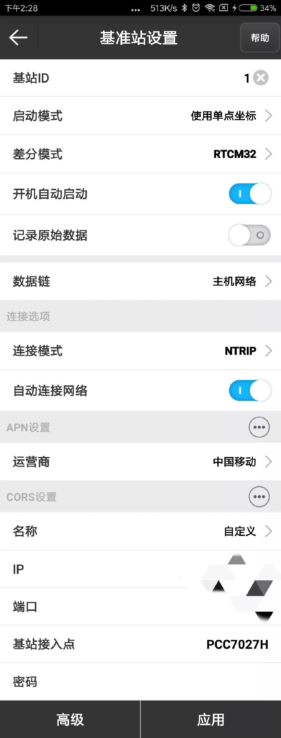 首先,我们对基站的进行设置,使用蓝牙或者WIFI连接G6后,进入基站设置如下:启动模式可以使用单点坐标或指定坐标、差分模式设置为RTCM32,连接模式设置为NTRIP、输入由我司提供的IP和端口,基站接入点设置为仪器编号,设置完毕后应用,中间信号灯闪烁后,代表基站设置成功。