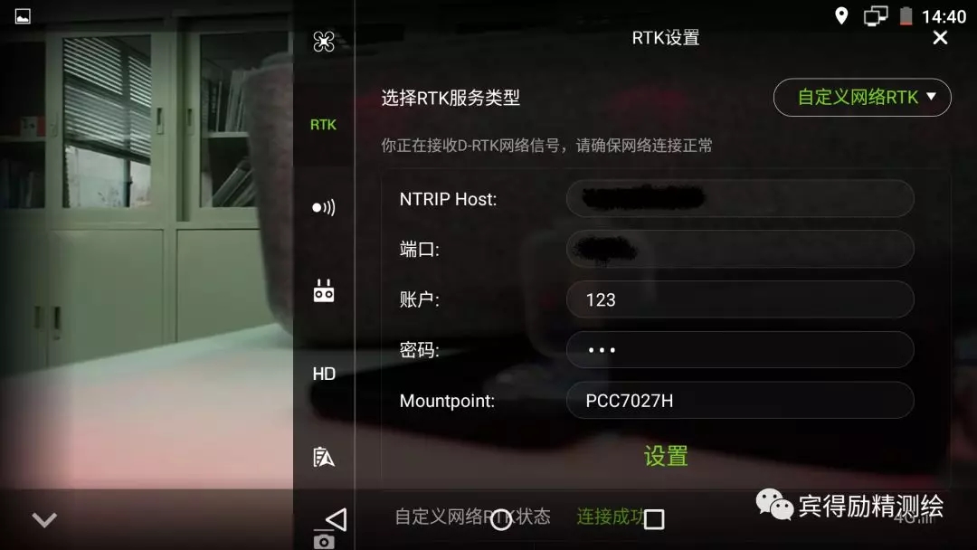 NTRIP Host和端口处分别输入我司提供的数据中心与端口,账户与密码任意输入,接入点(Mountpoint)处输入基站编号,输入完成后点击设置,提示连接成功即可使用。