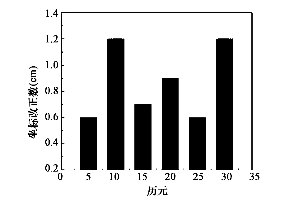 由此可知,求得改正后的,随即得到双差观测方程,并以该方程为基础建立流动站偏离真实值的误差方程,由此得到流动站坐标的误差值Δx、Δy、Δz,最终即可得到流动站的准确坐标。
