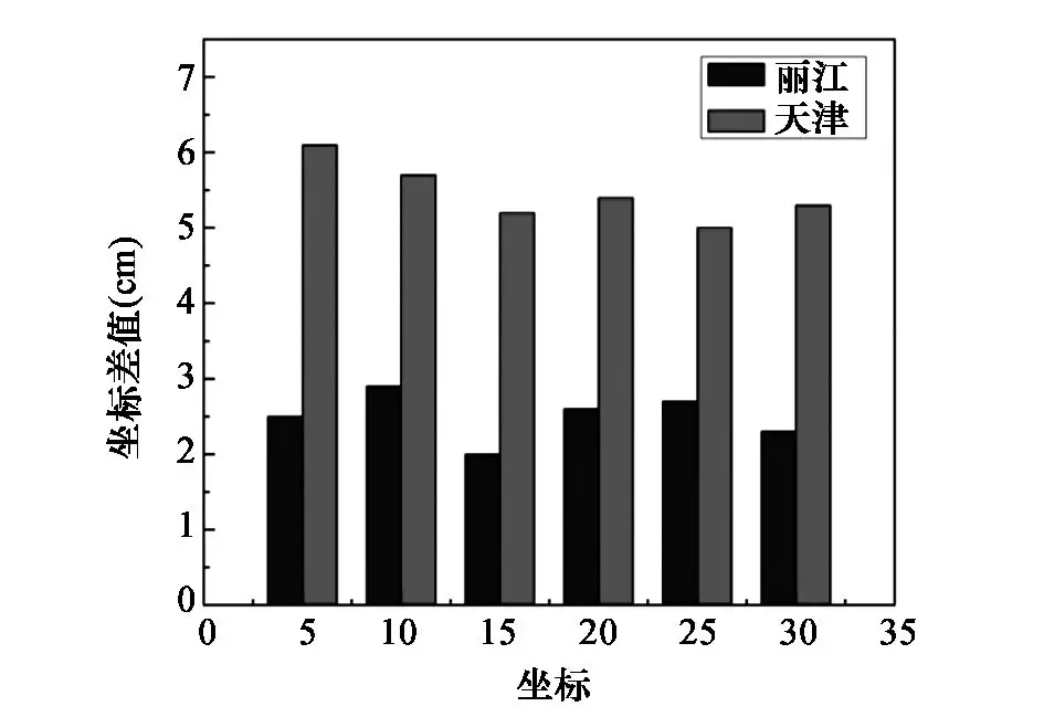 为了降低流动站位置对定位精度的影响,我们分别对丽江及天津两个海拔差距较大的城市采用相同的流动站与基准站的点位关系进行考察,并对由内插法计算出的流动站坐标与实际坐标的差值进行了对比分析,其数据如图4 所示。