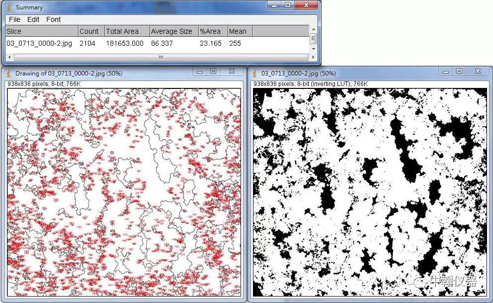 利用一套免费的简易影像处理软体『imageJ』,计算点云与背景的比例,即可得到样