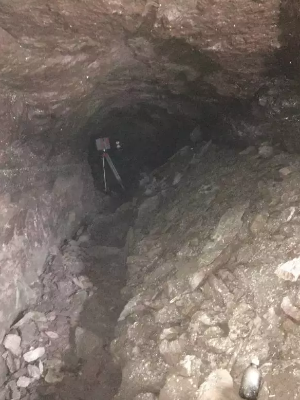 四川川南地区60 年代在城区内建造的防空洞,由于临近景区,当地政府想将此防空洞改造为通往景区的人行隧道。防空洞为一条主洞和一条支洞构成,支洞未贯通,需要确定支洞另一端的位置。由于防空洞比较小,宽2 米左右,最高处2 米左右,大部分地方需要人员弯腰才能通过,GPS 无法测量,使用全站仪速度慢,测量周期长。