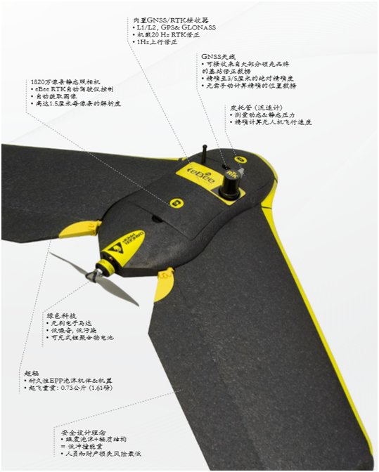 eBee采用后置螺旋桨设计,柔软的泡沫结构令其重量仅有700克,可将冲撞时的能量减至最低。