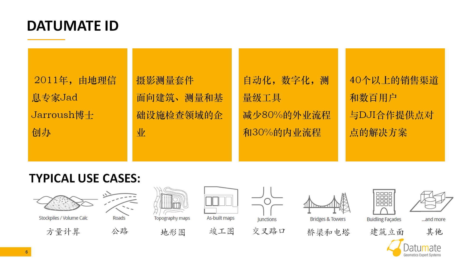 DatuSurvey以全自动、高精度且高效率低成本的解决方案转变了建筑、测量和基础设施检验市场上使用的土木工程流程,确保了野外作业人员的安全。Datumate使用了先进的图像处理技术,高级无人机和摄像机技术,大大降低了测量人员的野外作业时间,加速建筑流程检查,缩短基础设施的检验时间,同时保持了测量级精度。