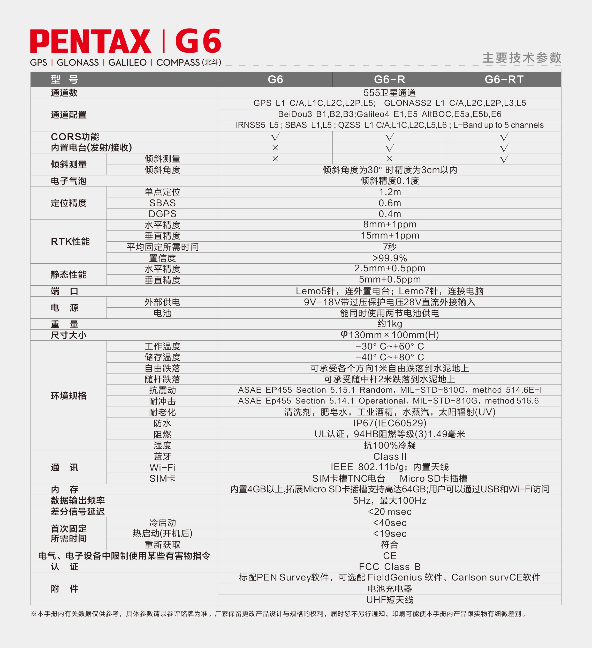 PENTAX(宾得)最新推出的 G6 系列GNSS接收机,全视场跟踪 GPS/GLONASS/GALILEO/COMPASS (北斗卫星)信号,以获取牢固准确的卫星定位。G6 系列接收机提供卓越的性能和强大的应用,广泛应用于线路测量、桥梁建筑、土木工程、地质勘查等多种测绘项目。