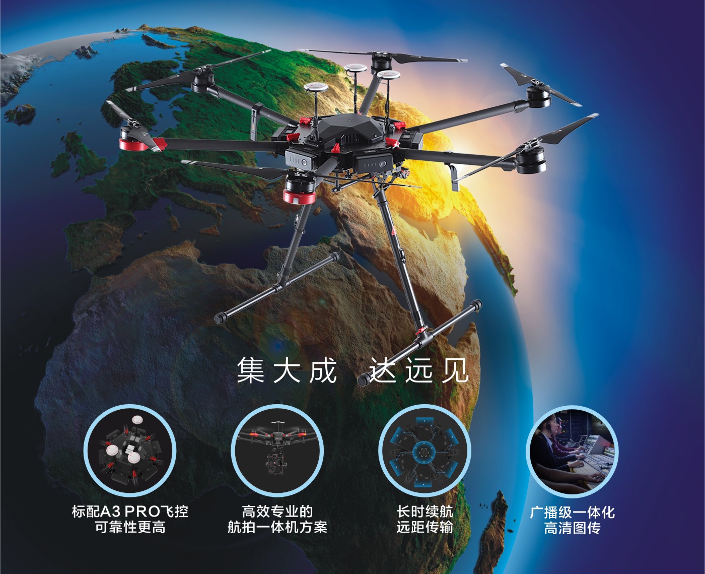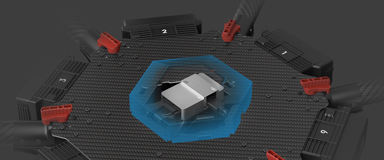 M600集成全新专业级A3飞行控制系统并采用正弦驱动技术的智能电调,提供高效、